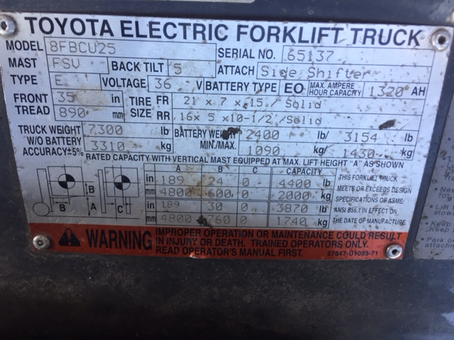 Southeast Industrial Equipment is offering the Used 2013 Toyota 4-wheel Electric Forklift 8FBCU25 for sale, lease or rent. This Toyota Electric powered unit located at our Wilson, NC branch. Because our inventory is always changing, please contact us with any questions about this 4-wheel Electric Forklift during business hours at (866) 696-9125 or contacts@sielift.com and we will answer any questions you may have about our current inventory or to discuss your materials handling needs. We offer service solutions for all lift trucks and material handling equipment whether on-site at your location or ours. We have 10 forklift dealerships in Charlotte, NC, Duncan, SC, Florence, SC, Charleston, SC, Columbia, SC, Wilson, NC, Savannah, GA, Richmond, VA, Raleigh, NC and Hampton Roads, VA.