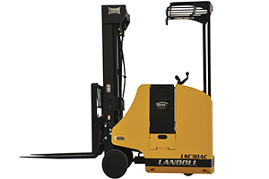 Landoll manufactures two lines of Narrow and Very Narrow Aisle forklifts. The Bendi Electric or IC powered forklifts provide the world’s first 180° articulating mast, front wheel steered design, providing unmatched maneuverability in narrow aisle storage. The Drexel SwingMast® fork trucks are electric or IC powered and have a 90° rotating and shifting mast that operate as a front or side loader that can stack pallets or long loads in aisles as narrow as 56″ (1.4M). Landoll Bendi, and Drexel Narrow Forklifts are proven solutions for storage space optimization. By design, neither the Bendi nor the Drexel SwingMast® swing the rear end while stacking so product and rack damage is minimized during product put away or retrieval. Landoll also manufactures two other models of electric forklifts. A Drexel EX (UL Certified explosion proof) front loading lift truck is designed to operate in hazardous flammable atmospheres. The Landoll stand up compact forklift, the LSC, which provides a low cost solution for increased efficiency when stacking or performing dock work, working in bulk storage or on the manufacturing floor and while stacking in drive in racking.