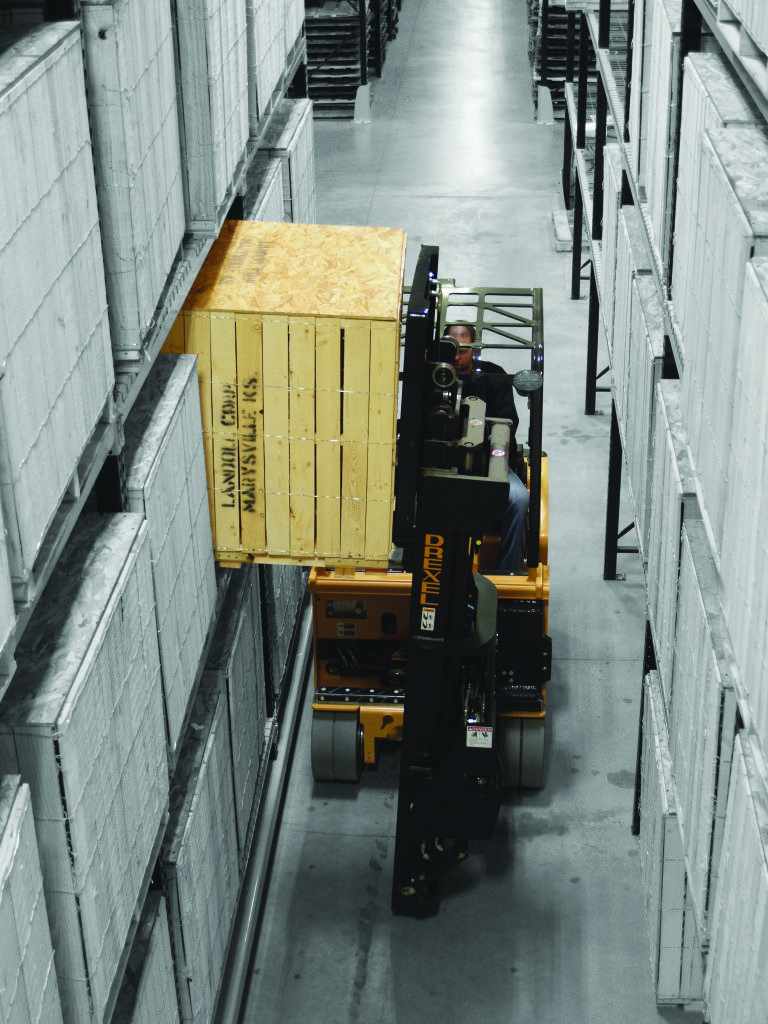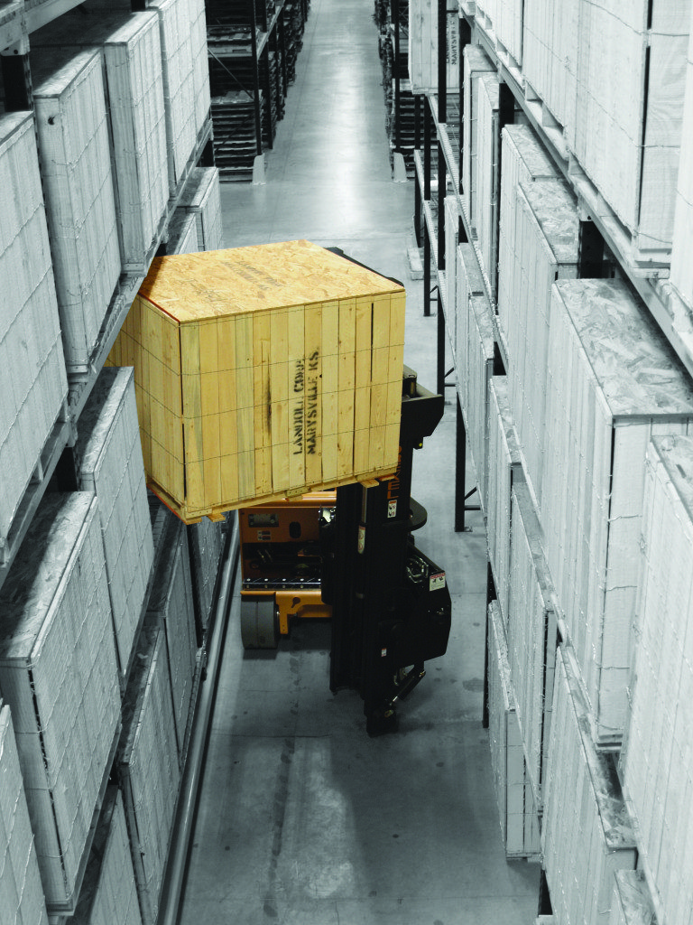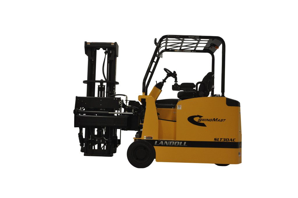 The Drexel model SLT30AC and SLT35AC work in aisles as narrow as 56″ (1.4M), have a basic capacity of 3,000 lbs. (1363kg) or 3,500 lbs. (1590kg) at 24″ (600mm) load center and lift heights available to 26′ (7.92M). The SLT30AC and SLT35AC are 3-wheel front/side loading VNA forklifts with a single smooth rubber rear-drive/steer tire and solid poly-front load tires. The front mast rotates 90° and has side shift of 20” (500mm), allowing stacking easily in Very Narrow Aisles. Both models can work inside and outside on paved surfaces, can perform the jobs of a normal front loading forklift (including loading and unloading highway trucks and containers, working in bulk storage, drive in rack, push back rack, double deep and climbing steep ramps). The SLT30AC/SLT35AC range does the jobs of reach and counterbalanced trucks in aisles over 50% smaller. The rear steering and drive allow turning in short-cross aisles further increasing the storage density when compared to counterbalanced trucks.
